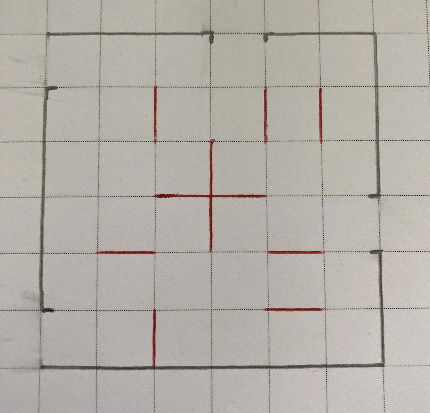 For the puzzle I drew at the top of the page, I started with a 6x6 grid as this gives the designer a lot of freedom to make the solution wind around the space quite nicely. Usually when drawing these I think of a path that would be interesting then construct the walls afterwards. For this I quite liked a the puzzle being oriented around the centrepiece below.