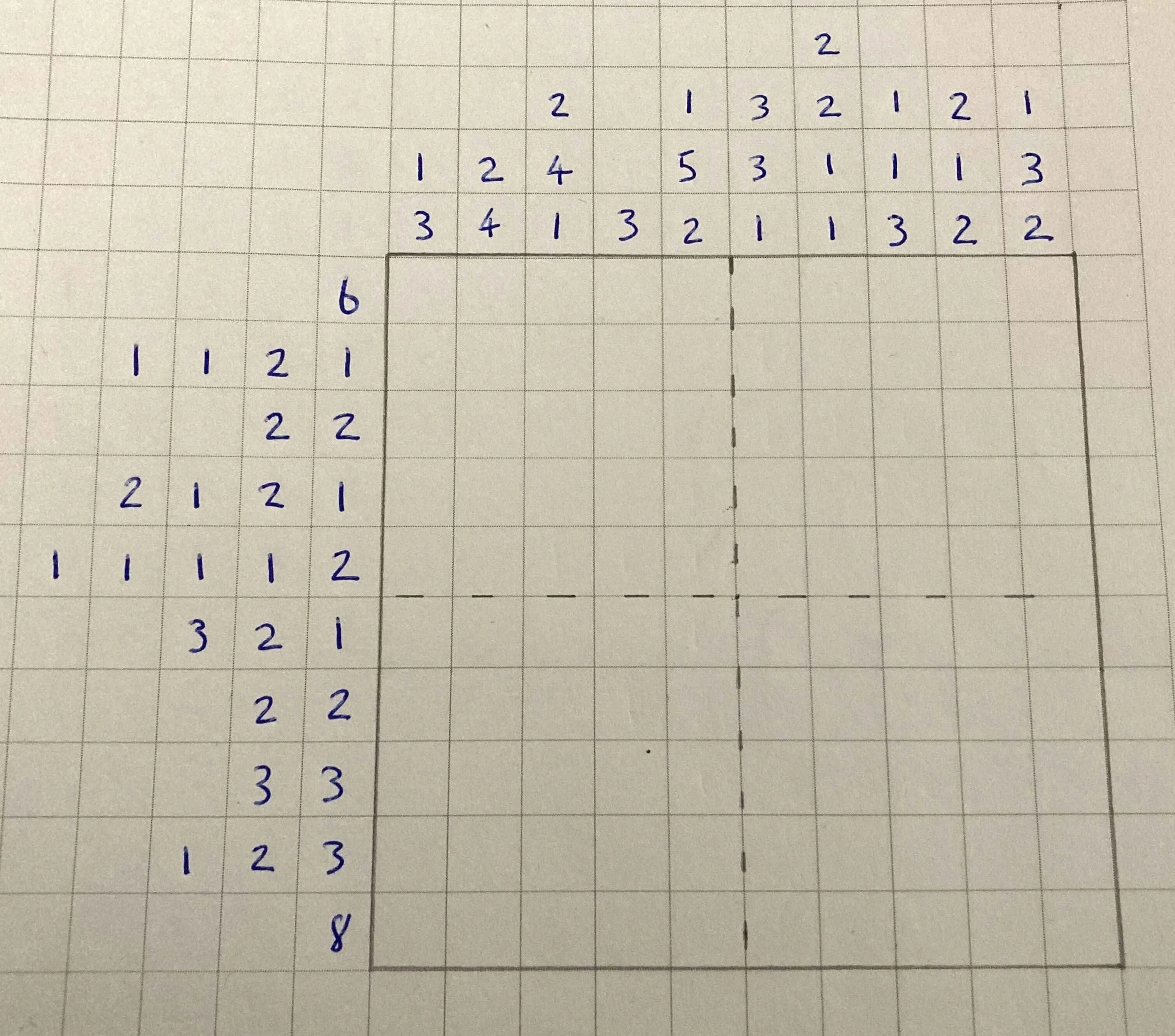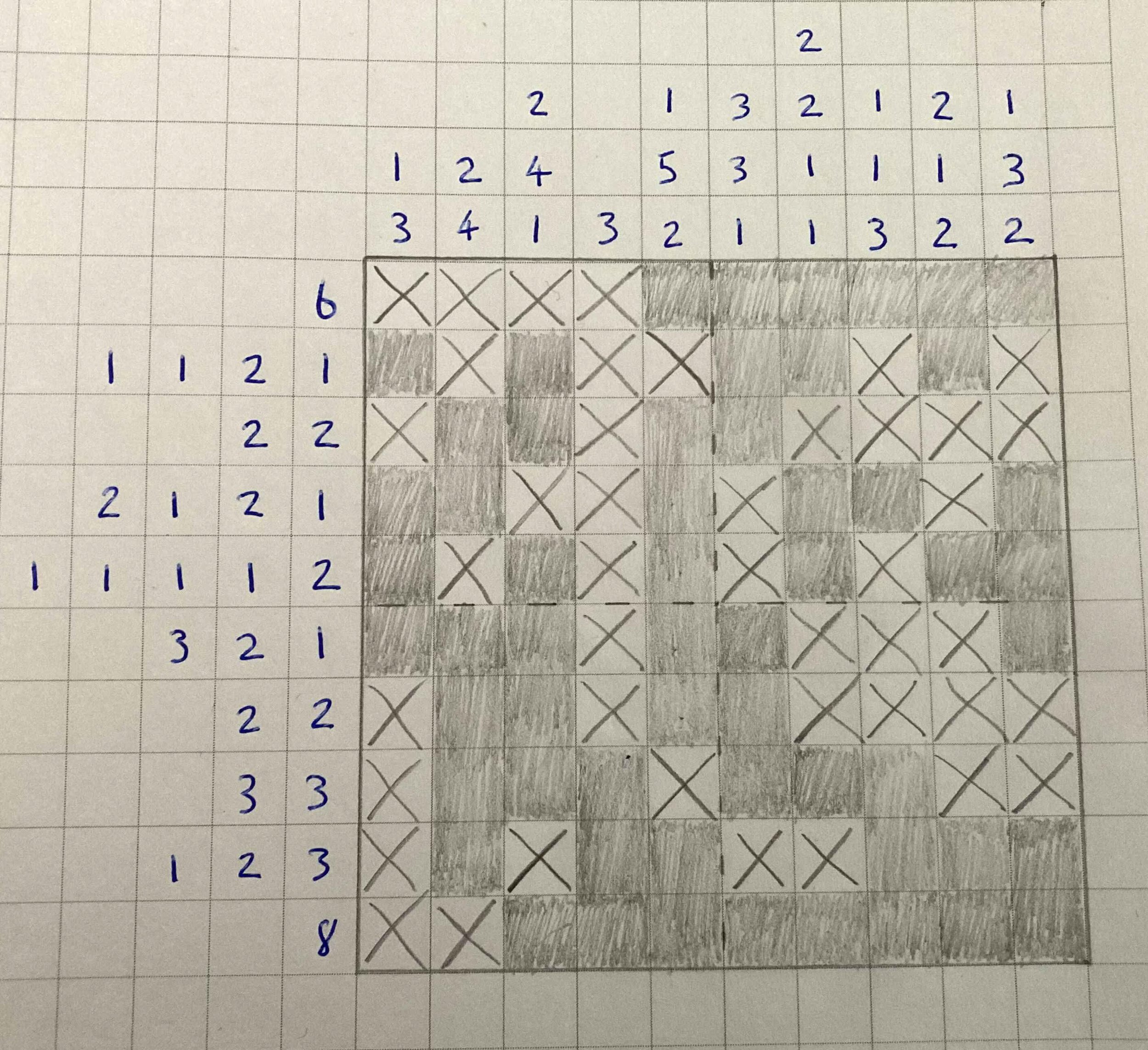 I drew pages and pages of these puzzles last year to try and get better at them and discover how you go about crafting them because, like all puzzle design, it is deceptively difficult at the start to make something good. Going back to making nonograms again was quite a joy so I took some of the lessons from drawing labyrinths to this as well. Which is to say I started off by drawing a number of blank grids to prep myself for the iteration process.