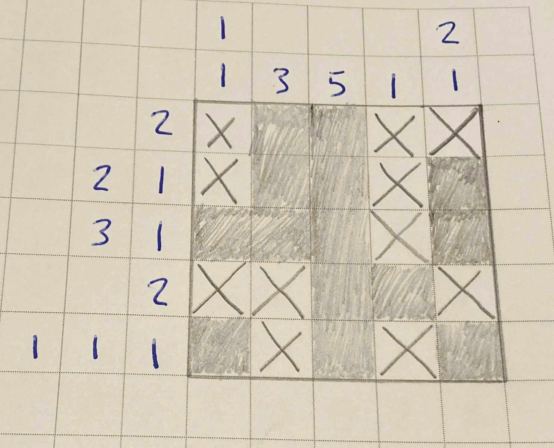 So we can see a small 5x5 example of a filled out nonogram puzzle where boxes to be filled in are shaded in and boxes that are not to be filled in have an ‘X’ marked in them. The ‘X’ is an important tool for players to figure out where filled in boxes shouldn’t go and constrains the solving process.
