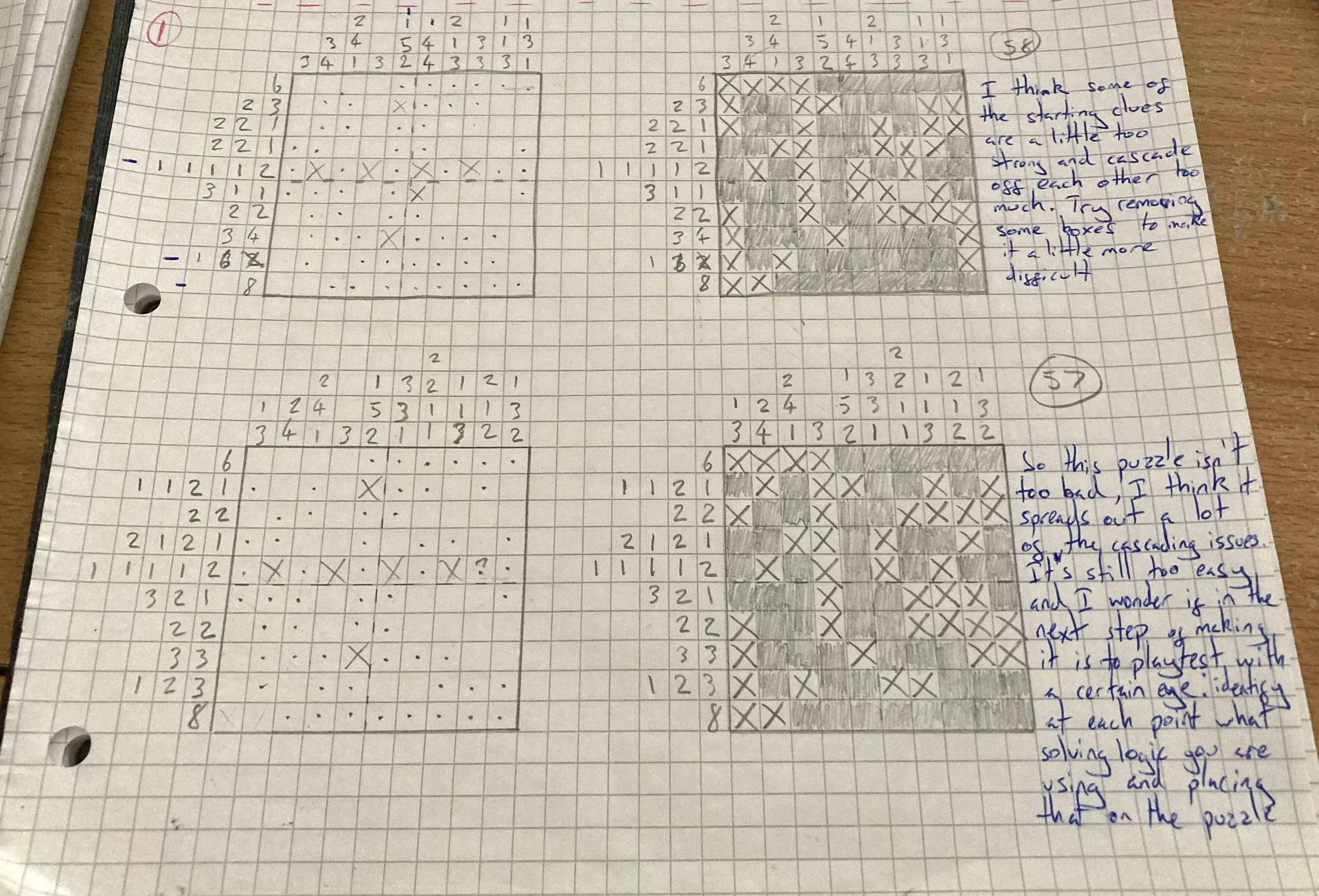 For the finished puzzle I use 1cm graph paper, but for iterating quickly on getting the base structure down I also used 0.5cm graph paper. I discovered with this one that you probably want to use both sizes. The latter for quick iteration and getting ideas down. The former for focused playtests which account for how different solving logic is being applied throughout the puzzle and at which points.